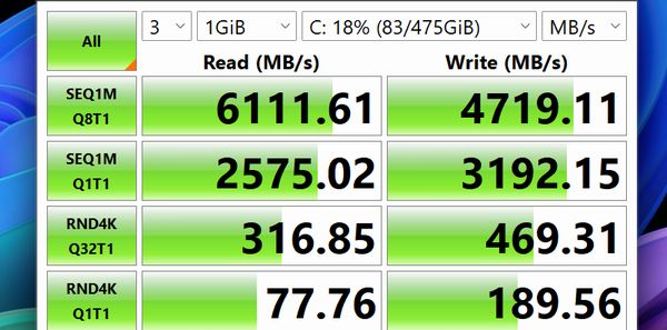 「CrystalDiskMark」を使用して読み取りテスト,書き込みテストをおこないました。本機はSSDを搭載しているのでHDDに比べて読み込みや書き込みの速度が速くなっています。